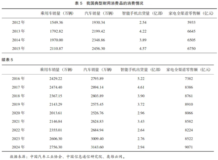 从消费结构来看,我国耐用消费品的排浪式发展阶段已过,服务消费将成为消费增长的主动力。如表5所示,我国大部分耐用消费品在2020年之前就达到了消费顶峰。2024年在“以旧换新”等国家政策刺激下,耐用消费品重新出现了增长。然而,由于耐用消费品的特性,这种政策刺激带来的消费增量难以持续。2025年8月,因为部分地区政策支持力度减弱,与家电、汽车等相关的以旧换新品类销售开始增长乏力。家用电器和音像器材类产品8月份的消费额仅为861亿元,较1-7月的平均消费额(1136亿元)下降了24%。汽车类消费1-8月总体增速为0.5%,8月当月为3849亿元,较1-7月的平均消费额(4466亿元)下降了14%。从横向比较来看,我国耐用消费品的消费量与发达国家相比虽有差距,但差距并不如想象的那么大。在家电等领域,我国与发达国家的消费差距要远小于国民收入的差距。