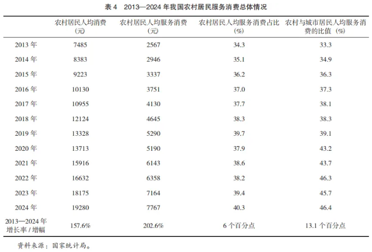 从城乡比较来看,我国农村地区服务消费呈现人均消费水平较低、增长较快的特征。如表4所示,2013-2024年,我国农村居民人均服务消费额从2567元增长至7767元,增长了5200元,增长率为202.6%,快于城市(117.1%)和全体居民(148.1%),也快于农村总体消费增长率(157.6%),在农村居民消费中的比重也从34.3%增长至40.3%,增长了6个百分点。农村地区服务消费的快速增长,使其与城市的差距也日益缩小。2013年时,农村居民人均服务消费额相当于城市的三分之一,到2024年时,已接近一半(46.4%)。这些数据反映了下沉市场的服务消费市场在日益完善,服务设施等正在优化。例如,美团数据显示,截至2025年3月底,县域餐饮、休闲娱乐门店数同比分别增长4.5%和23.0%,占全国相应类别门店总数的比重分别达到37.5%和35.8%,较2024年一季度末分别提高1.3和3.2个百分点。这些因素带动了下沉市场服务消费的快速增长。2025年第一季度,县域餐饮堂食、餐饮外卖、休闲娱乐消费对全国消费的贡献率分别为15.8%、20.4%和15.2%,较上年同期分别提高1.3、0.6和1.9个百分点。其中,在2025年春节假期,县域地区餐饮堂食、休闲娱乐消费同比分别增长23.4%、40.8%,增速高于全国总体水平。农村居民在旅游等领域的消费呈现快速增长的趋势。根据国内旅游抽样调查统计结果,2024年,农村居民国内出游人次为12.45亿,同比增长9.9%;出游花费8300亿元,同比增长12.2%。