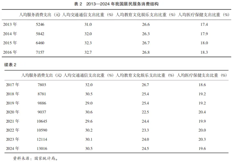 如表2所示,从服务业内部消费结构来看,服务消费有着由生存型向享受型和发展型变化的趋势,即交通通信等消费支出的比重有下降趋势,而医疗保健等消费支出的比重有上升趋势。田野利用经济合作与发展组织2023年版全球投入产出表数据的研究表明,我国服务消费向享受型和发展型变化的趋势明显,1995-2020年,生存型服务消费和发展型服务消费占最终需求的比重分别从5.95%、6.95%增长至9.36%、11.35%,享受型服务消费占最终需求的比重从0.52%增长至0.77%。