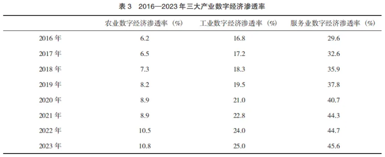 从整体上看,我国服务业数智化水平持续提升,服务业也成了我国数字经济渗透率最高的产业。根据中国信息通信研究院的数据(表3),2023年,我国服务业数字经济渗透率为45.6%,较2016年提升了16个百分点,是三大产业中数字经济渗透率最高的;同年,工业和农业的数字经济渗透率仅分别为25.0%和10.8%。服务业的数智化带动了服务消费的线上化。笔者根据公开数据计算的结果显示,近年来,我国服务类消费网络零售额保持快速增长态势,从2011年的约800亿元增长至2024年的约2.44万亿元,占网络零售消费额的比重则从约10%上升至15.7%。