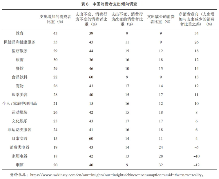 从消费者微观偏好来看,消费服务化迹象已经非常明显。中国人民银行《2025年第二季度城镇储户问卷调查报告》的数据表明,在消费者的支出预算方面,位列前四位(旅游、教育、医疗保健、社交文化和娱乐)的都属于服务消费。如表6所示,麦肯锡的消费者调研表明,消费者将更多的钱投入与服务、体验相关的消费中。