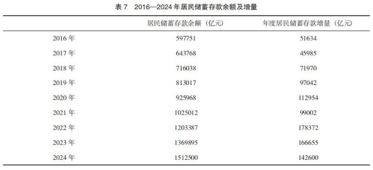 一是居民不敢消费的心态较为普遍。服务消费具有一定的弹性,容易受到消费预期、收入预期、就业预期等各种因素的影响,这将影响服务消费的可持续性。当前,我国居民预期偏弱。中国人民银行发布的《2025年第二季度城镇储户问卷调查报告》显示,二季度居民就业感受指数为28.5%,比上季度下降1.8个百分点;超过一半的居民(53.7%)认为就业“形势严峻,就业难”或“看不准”;收入感受指数为45.0%,比上季度下降1.2个百分点,自2023年一季度以来已连续九个季度低于50%。预期偏弱促使居民形成强烈的预防性储蓄动机,从而挤占了当期服务消费的空间。中国人民银行数据显示(表7),2016-2024年,我国居民储蓄存款余额从不到60万亿元增加到150余万亿元,增量超过90万亿元;尤其是在2020-2024年,居民储蓄存款的增量接近60万亿元。而在服务消费方面,2025年上半年,全国居民人均服务消费支出同比增长4.9%,占居民人均消费支出的比重为45.5%,较2024年有所下降。