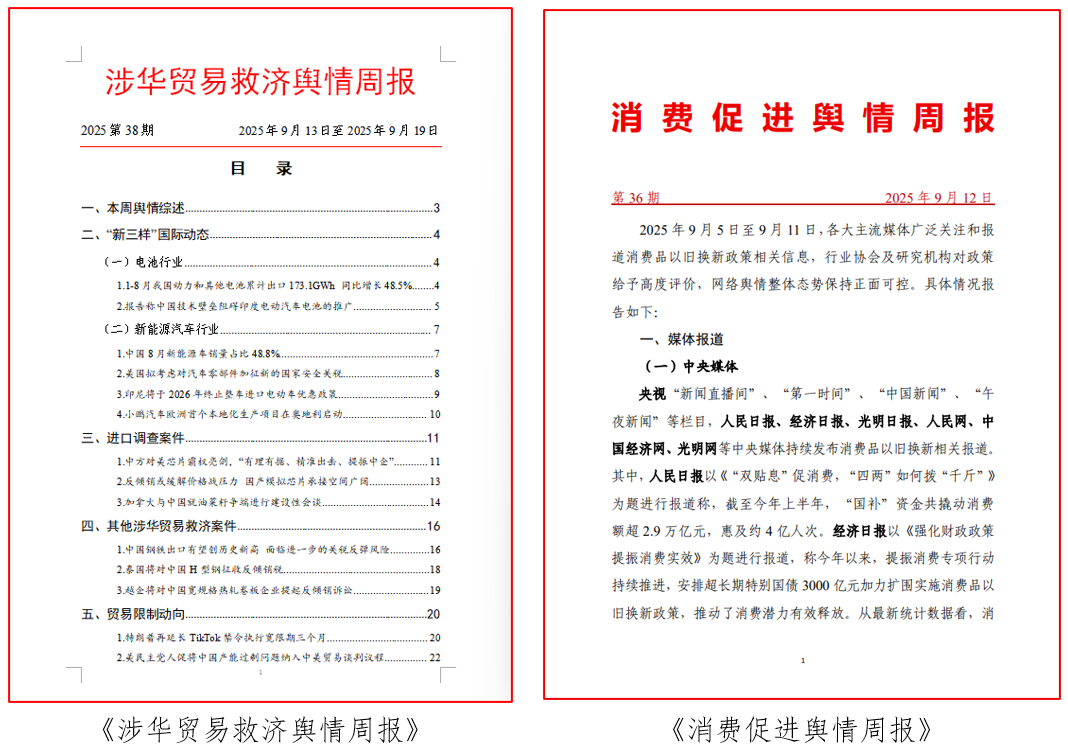 承接政府部门、机构及企事业单位“贸易救济舆情监测服务项目”,重点监测全球涉华贸易救济案件、政策动态及其对相关行业的潜在影响,定期编制提供贸易救济舆情日报和周报。针对重大案件或政策变化,提供专题分析报告,帮助客户精准研判国际贸易形势,有效应对贸易摩擦,提升决策效率与风险防控能力。